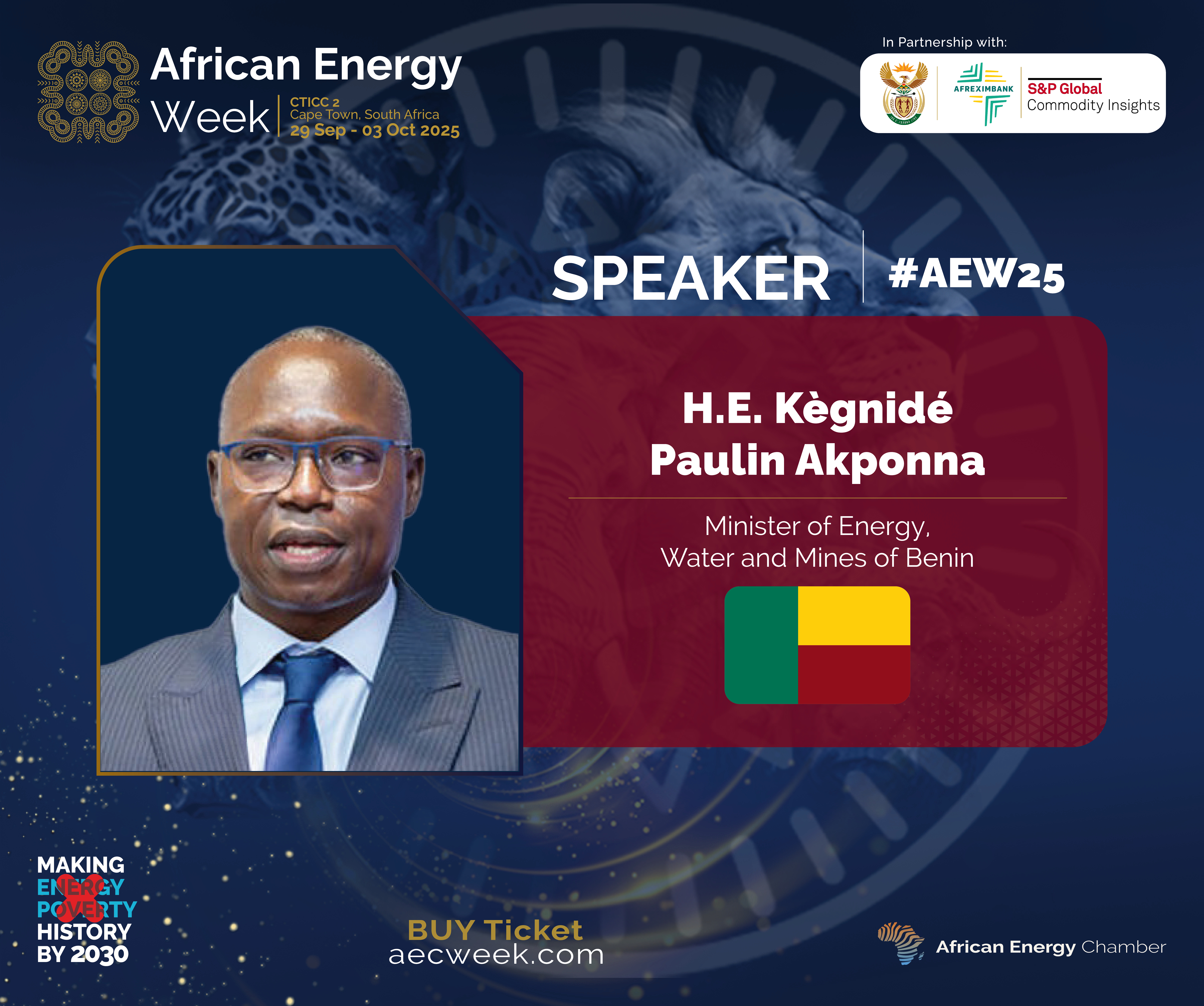 Back To Press Release Benin’s Minister of Energy, Water and Mines to Speak at African Energy Week (AEW) 2025 Amid Exploration, Energy Trade Surge All (1) Images (1) Kingnidé Paulin Akponna, Minister of Energy, Water and Mines of Benin (Source: African Energy Chamber | 8 months ago) Share Download HD Download SD Image